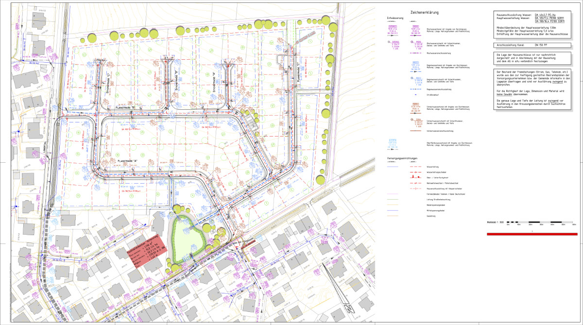 Die Entwässerung des ca. 4,5 ha großen Baugebietes erfolgt im Trennsystem, wobei das Niederschlagswasser über ein zentrales Regenrückhaltebecken bewirtschaftet wird.