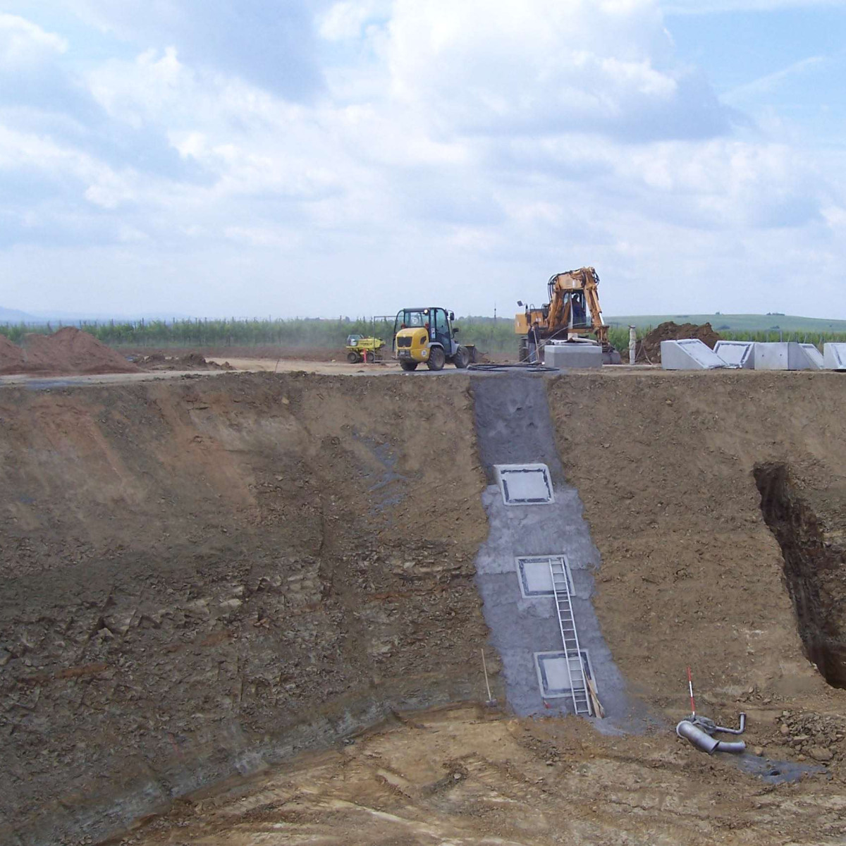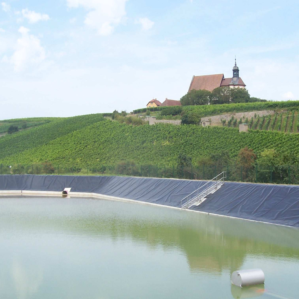 Die Speicherbecken mit einer Tiefe von je ca. 8,0 m und Volumina von 9.000 m³ bzw 14.000 m³ sind mit Folie ausgelegt, um das Absetzen feinster Partikel zu unterstützen.